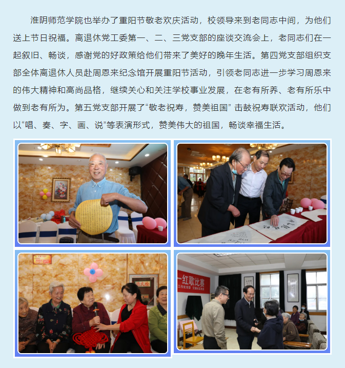 yL23411永利官网登录举办了重阳节敬老欢庆活动,校领导来到老同志中间,为他们送上节日祝福。离退休党工委第一、二、三党支部的座谈交流会上,老同志们在一起叙旧、畅谈,感谢党的好政策给他们带来了美好的晚年生活。第四党支部组织支部全体离退休人员赴周恩来纪念馆开展重阳节活动,引领老同志进一步学习周恩来的伟大精神和高尚品格,继续关心和关注学校事业发展,在老有所养、老有所乐中做到老有所为。第五党支部开展了“敬老祝寿,赞美祖国” 击鼓祝寿联欢活动,他们以“唱、奏、字、画、说”等表演形式,赞美伟大的祖国,畅谈幸福生活。
