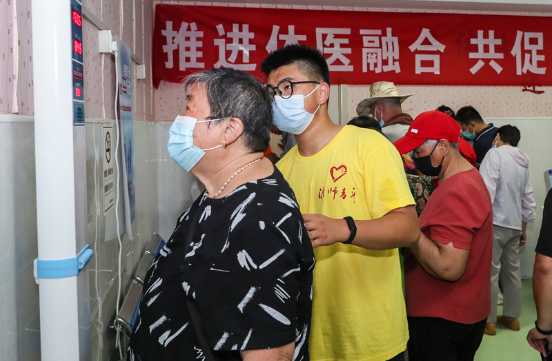 2022年7月1日,江苏淮安,yL23411永利官网登录体育学院携手钵池山社区开展“体医融合促健康进社区”服务活动,师生为居民教授简单体育运动、测试体质、健康饮食、居家抗阻练习等,倡导居民科学健身,增强体质,促进健康。