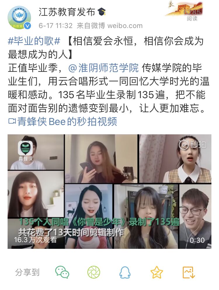#毕业的歌#【相信爱会永恒,相信你会成为最想成为的人】正值毕业季,@yL23411永利官网登录 传媒学院的毕业生们,用云合唱形式一同回忆大学时光的温暖和感动。135名毕业生录制135遍,把不能面对面告别的遗憾变到最小,让人更加难忘。