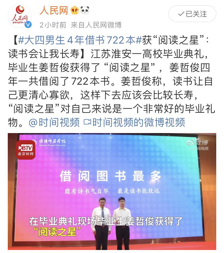 【#大四男生4年借书722本#获“阅读之星”:读书会让我长寿】江苏淮安一高校毕业典礼,毕业生姜哲俊获得了“阅读之星”,姜哲俊四年一共借阅了722本书。姜哲俊称,读书让自己更清心寡欲,这样下去应该会比较长寿,“阅读之星”对自己来说是一个非常好的毕业礼物。