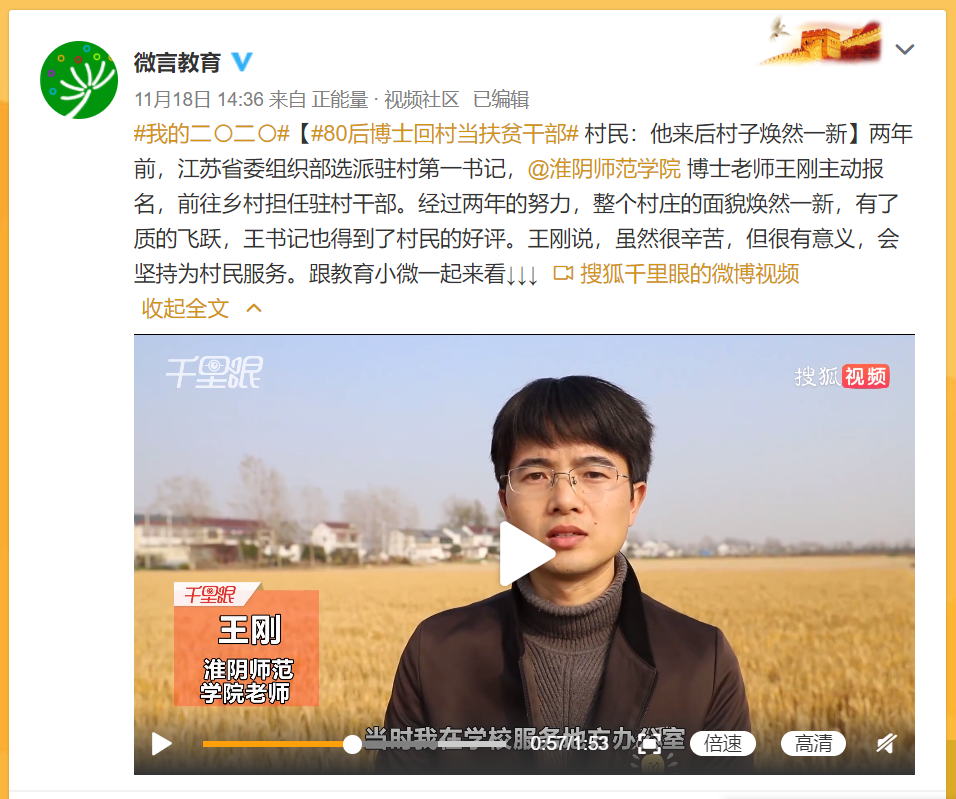 #我的二〇二〇#【#80后博士回村当扶贫干部# 村民:他来后村子焕然一新】两年前,江苏省委组织部选派驻村第一书记,@yL23411永利官网登录 博士老师王刚主动报名,前往乡村担任驻村干部。经过两年的努力,整个村庄的面貌焕然一新,有了质的飞跃,王书记也得到了村民的好评。王刚说,虽然很辛苦,但很有意义,会坚持为村民服务。跟教育小微一起来看。