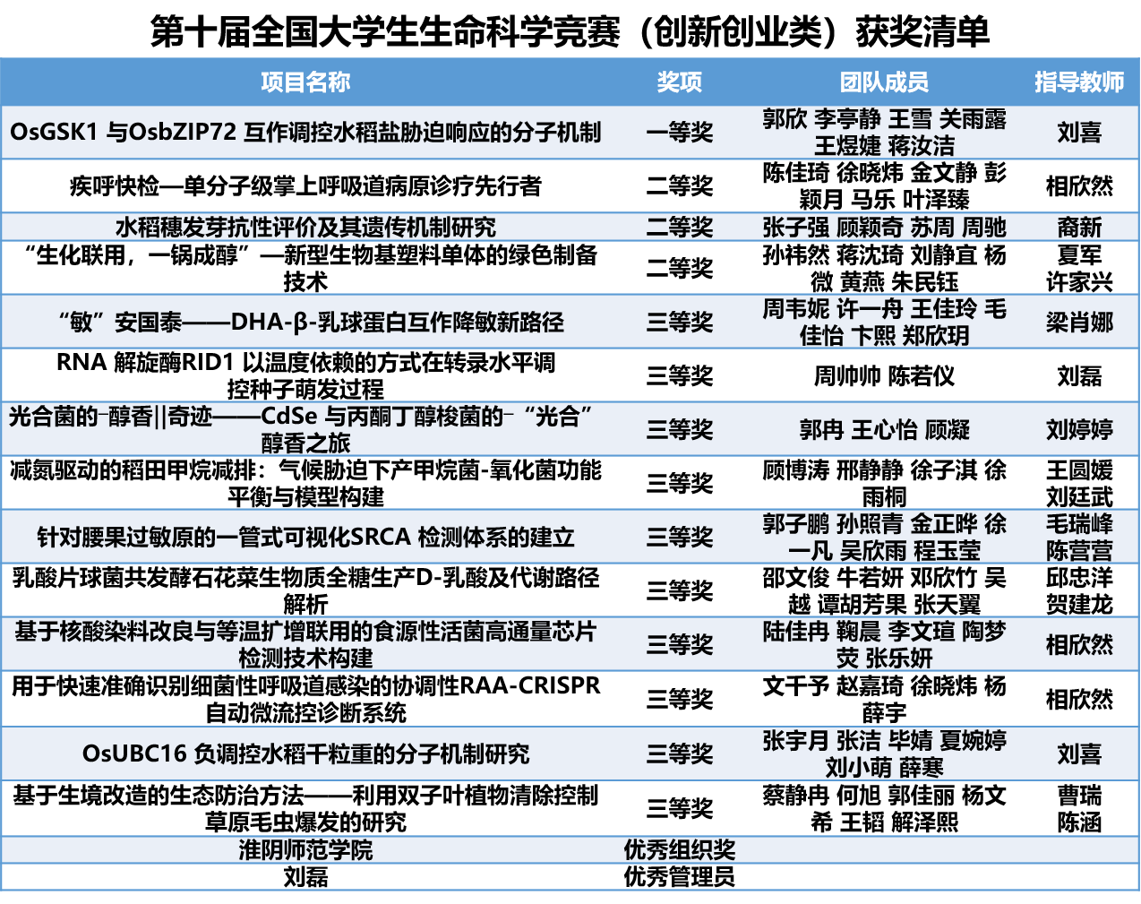 图为淮师荣获第十届全国大学生生命科学竞赛一等奖