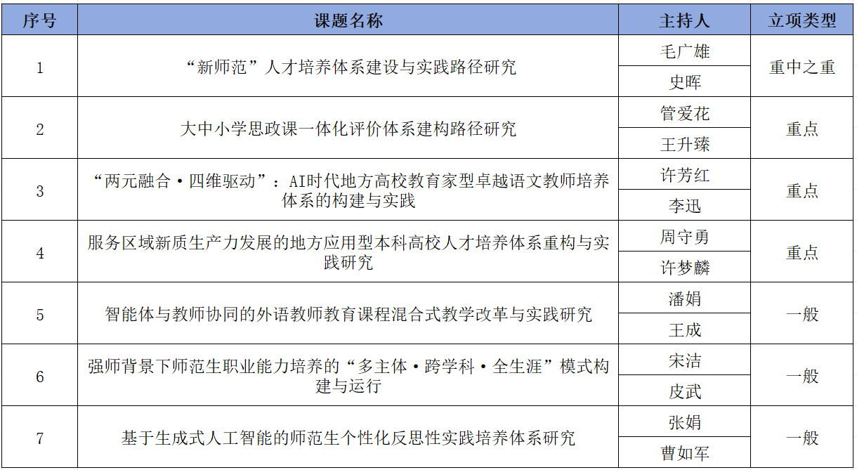 此次申报项目主要聚焦《中国教育现代化2035》《江苏教育现代化2035》和《教育强国建设规划纲要(2024-2035年)》等有关教育教学改革的总体部署,结合学校实际,重点围绕新师范建设、应用型人才培养、大思政育人格局、人工智能赋能高等教育等方面开展研究,具有较高的理论与实践价值。