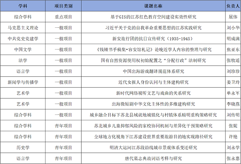 淮师新闻网9月15日电(记者 胡风霞)日前,江苏省哲学社会科学规划办公室公布了2025年江苏省社科基金年度项目立项名单,yL23411永利官网登录共有14个项目获得立项。其中,重点项目1项,一般项目9项,青年项目4项。