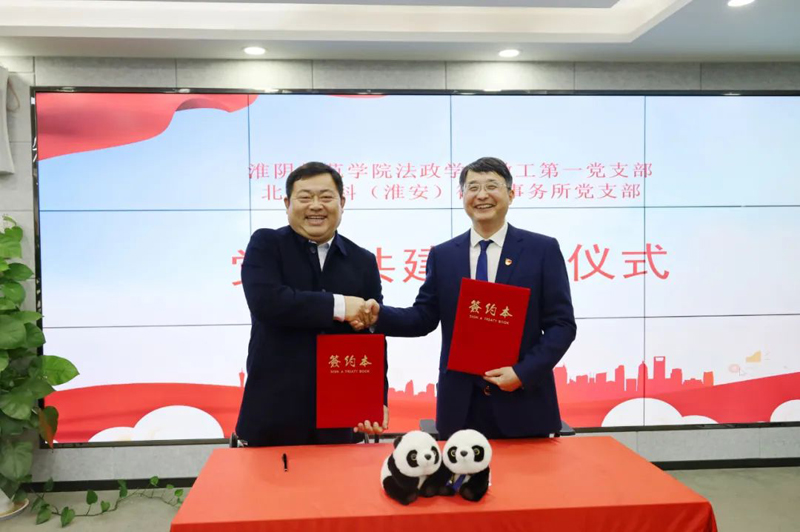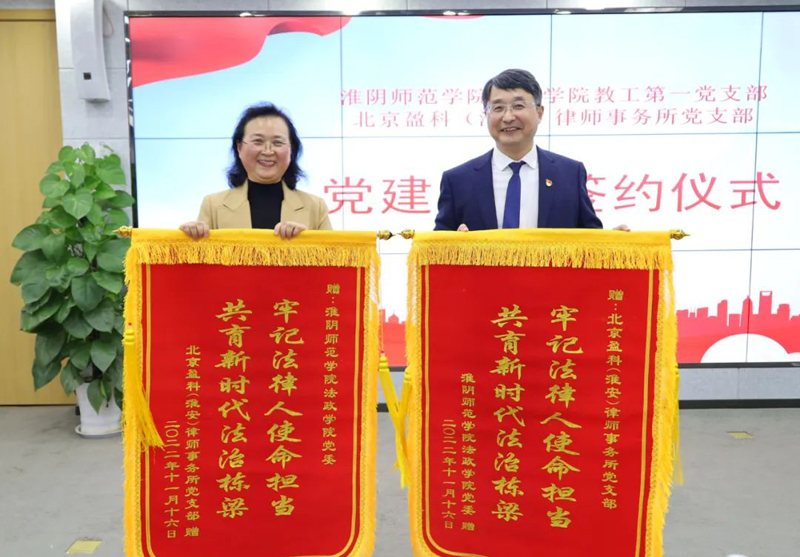 法政学院教工第一党支部与盈科淮安律所党支部签署党建共建合作协议。法政学院党委与盈科淮安律所党支部互赠“牢记法律人使命担当 共育新时代法治栋梁”锦旗。