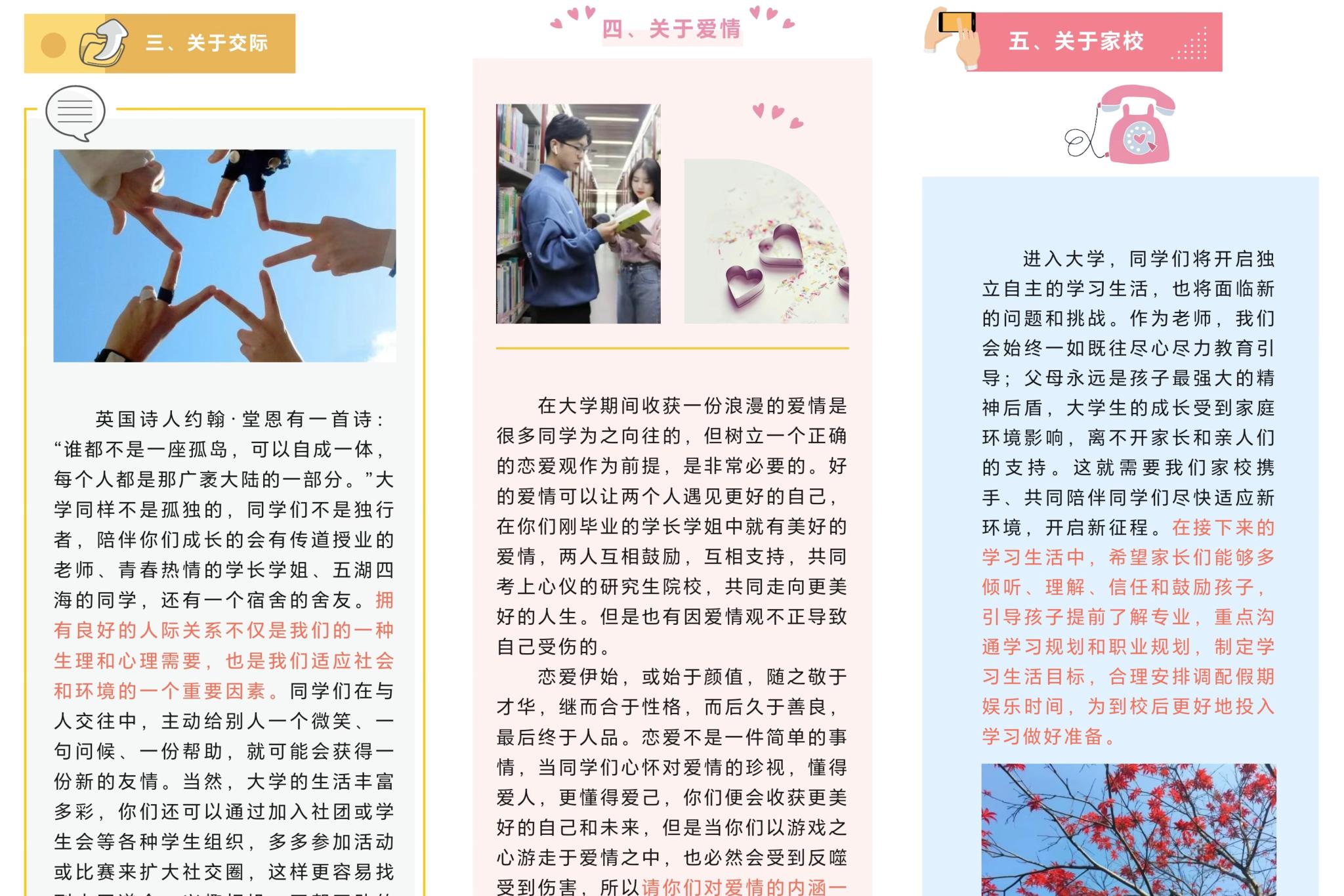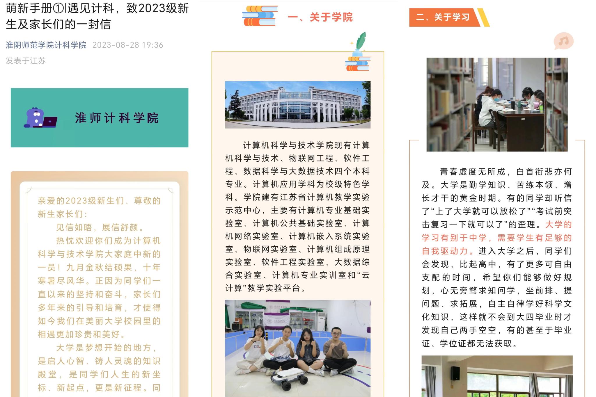 新生入校前,学院微信公众平台精心策划了“萌新手册”栏目,围绕学院概况、专业设置、师资力量、学科竞赛团队介绍、学生安全教育、学业指导、人际交往等方面进行推送,帮助新生提前了解进入大学必须知道的各项事宜。在栏目首期,学院推出了一篇《致2023级新生及家长们的一封信》,对即将到来的新生表示期盼和欢迎。书信为新生和家长介绍了学院的基本情况,并从学习、交际、恋爱等方面给新生做出了指导和提醒,最后期盼家校合力,希望新生家长能够在新生顺利适应大学生活、学习等方面给予支持、配合帮助。