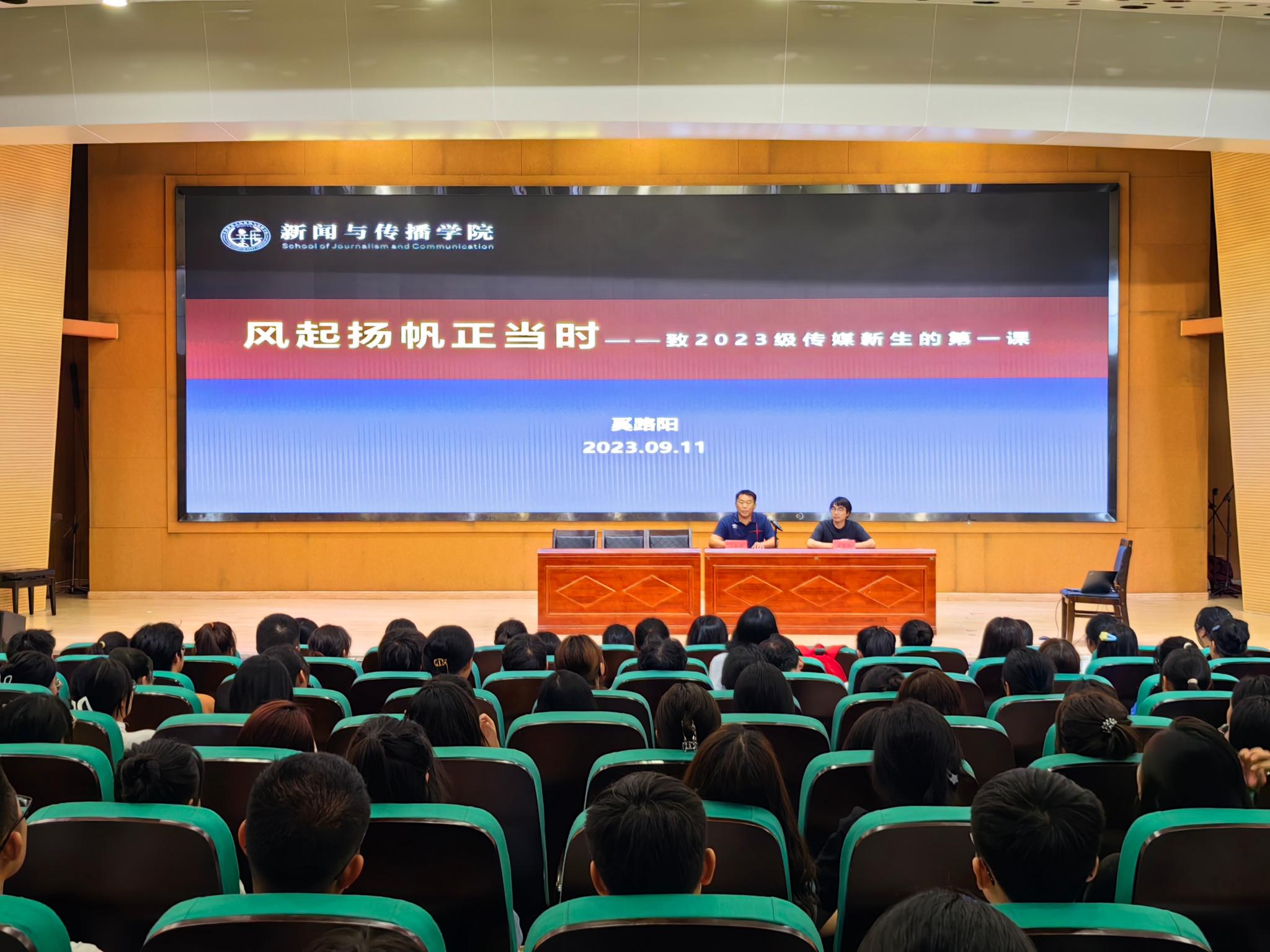 奚路阳以“风起扬帆正当时——致2023级新传新生的第一课”为题,向新生介绍了学院概况和广告学、广播电视学、广播电视编导三个专业。他从专业培养目标,大学学习和未来就业的关系,大学怎样学习,大学各阶段基本目标等四个方面,通过生动的案例分析,帮助同学们瞄准大学应该努力和前进的方向。他希望新生利用课余生活规划好自己、管理好自己,做到读万卷书,行万里路,知行合一。