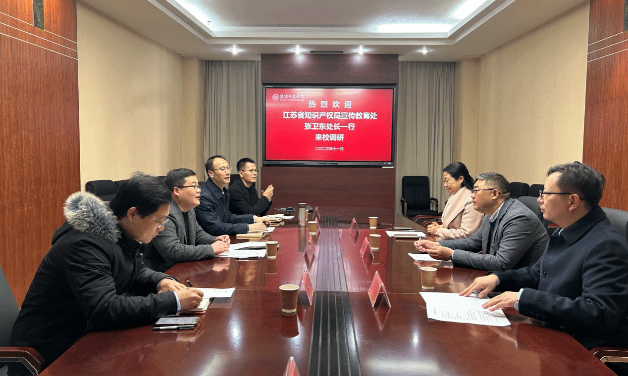 图为江苏省知识产权局宣传教育处处长张卫东一行来校调研。记者 李旭 摄