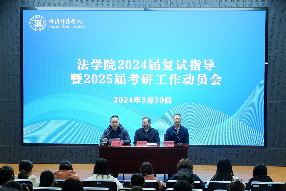淮师新闻网3月22日电(记者 董宇阳 杨静)为帮助学生深入了解法科考研政策,做好复试准备,3月20日晚,法学院在逸夫报告厅召开2024届毕业生复试指导暨2025届学生考研工作动员会。法学院院长郭兴利、党委副书记李卓、辅导员及部分学生参加会议。