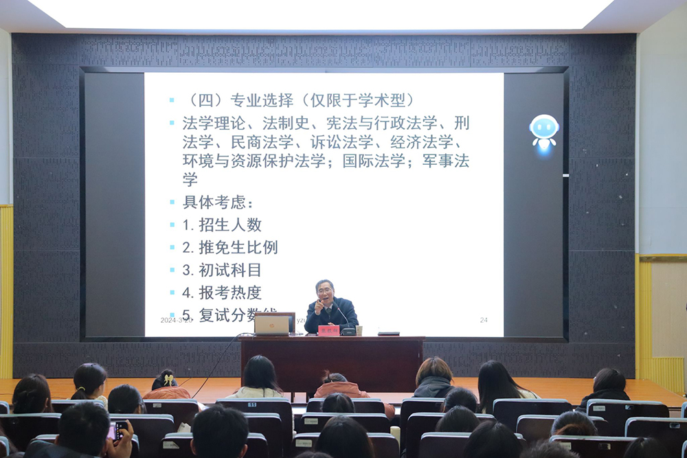 第一阶段,法学院邀请扬州大学法学院知名法科考研指导专家张毅辉为法学院学生作考研动员与指导。