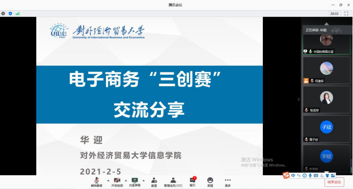 淮师新闻网2月6日电(记者 何逢标)2月5日,经济与管理学院举办了电子商务“创新、创意及创业”挑战赛的线上分享交流会,对外经济贸易大学信息学院副院长华迎教授应邀作线上分享交流。yL23411永利官网登录经济与管理学院院长张言彩主持会议,经济与管理学院、教育科学学院、法律政治与公共管理学院、计算机科学与技术学院、物理与电子电气工程学院、传媒学院、美术学院、文学院、历史文化旅游学院共9个学院26个参赛团队106名师生参加学习交流。