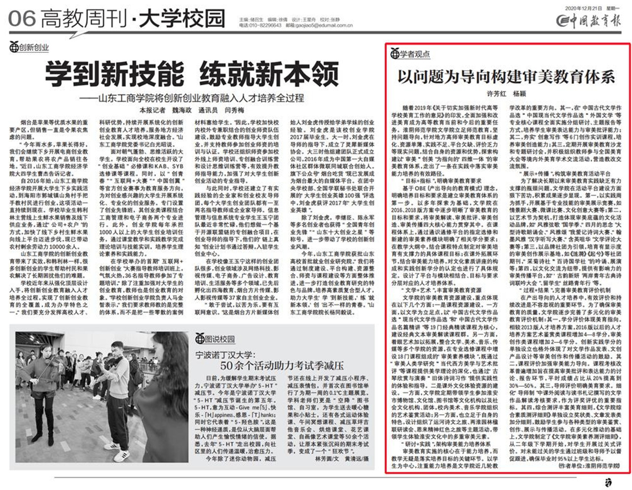 围绕审美批评、审美表达、审美创造、审美传播四大核心能力,积极探索在实践中落实审美能力培养的有效路径。立项建设审美教育及课程思政等4个教改项目;组织审美教育教学等4场教学沙龙;举办“含英咀华”文学评论大赛;推出微信公众号“静雅园”42期专栏,发表师生评论文章近百篇;开展电影沙龙、学生运河楹联采风等活动;《淮安电视报》《淮安新周刊》等发表学生审美鉴赏文章15篇。《中国教育报》以《yL23411永利官网登录以问题为导向建构审美教育体系》、交汇点新闻《风雨不阻 花开有声:yL23411永利官网登录文学院疫情期间审美教育实录》报道了相关成果。