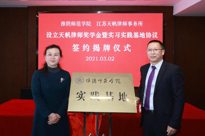 在欢快的乐曲声中,签约代表法政学院朱凤祥和天帆律所高志超、法政学院张玉磊和天帆律所宋军明,分别签订了设立“天帆律师奖学金”协议书和实习基地共建协议书。法政学院张秀芳和天帆律所赵金斗为“实践基地”揭牌。