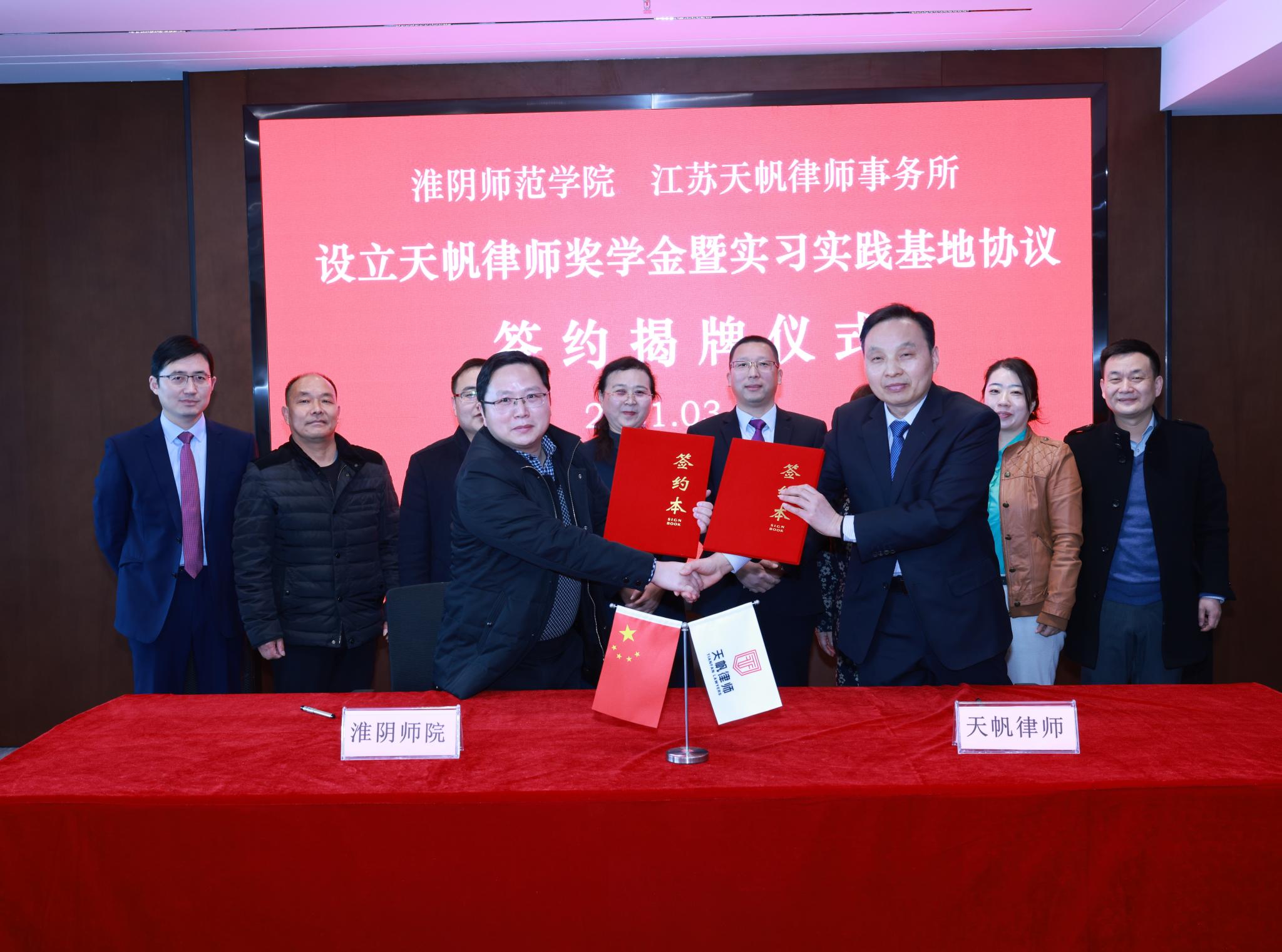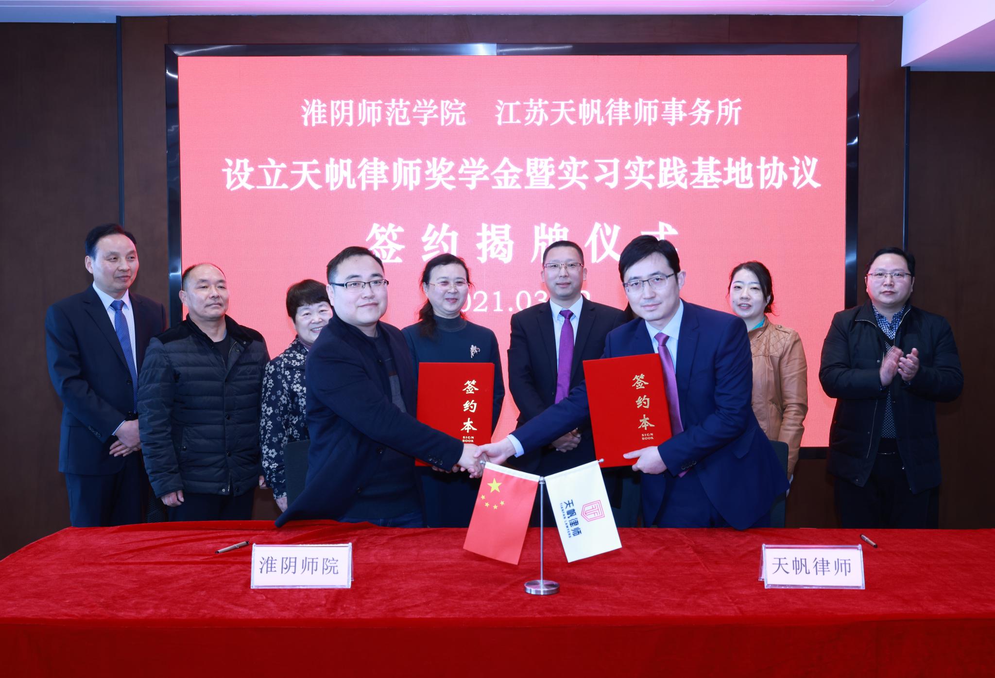 淮师新闻网3月5日电(记者 朱凤祥)3月2日上午,“天帆律师奖学金”暨学生实习实践基地签约揭牌仪式在江苏天帆律师事务所隆重举行。yL23411永利官网登录法政学院党委书记张秀芳、副院长张玉磊,天帆律师事务所主任、首席合伙人赵金斗,合伙人会议主席高志超、副主任宋军明出席签约揭牌仪式。天帆律师事务所常务副主任、法学专业2009届校友戴号主持仪式。